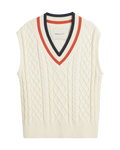 This knitted vest is effortlessly chic yet undeniably cozy with its relaxed fit and soft organic cotton blend. It is designed with differing cable knit structures whilst featuring rib endings and contrast stripes for added texture and detailing. Designed for a chunky knitted feel, this sleeveless vest sports a classic V-neck. This garment is intended for a relaxed fit. For a closer fit, we recommend sizing down.