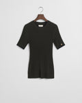 This sweater is made from a premium viscose blend for a soft handfeel and shiny quality. Cut for a slim fit, this sweater is designed with a multi-ribbed texture across the body and sleeves. It features a crew neck, short sleeves, contrast tip detailing and a GANT monogram charm in gold-tone hardware at the sleeve hem.