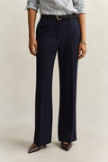 Endlessly wearable, these slacks are crafted with a touch of comfort stretch. Slim over the hips, these pants have a mid-rise waist and a flared leg. Design features include front slanted pockets, back welt pockets, crease detailing and a zip closure with a hook-and-bar fix.
