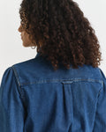 This denim dress made from certified cotton with heavy stitch detailing encapsulates effortless style. It’s designed for a regular fit with long sleeves and a length that falls to the knees. Features include a point collar, double chest pockets, and puff sleeves with gathered detailing and a keyhole opening at the cuffs. This dress has a row of snap buttons at the front, plus a thin belt tied at the waist.