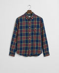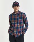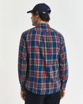 Crafted from a classic twill fabrication, this shirt is designed with a yarn-dyed indigo check pattern and a regular fit. The design features a classic button-down collar, adjustable cuffs, a curved hem, recycled polyester buttons and a GANT shield graphic embroidered at the chest pocket.