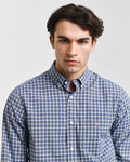 Crafted from 100% cotton and cut for a regular fit, this poplin shirt features an all-over checked pattern. Constructed with a classic button-down collar, the shirt is designed with a curved hem and adjustable sleeve cuffs. Detailed with a GANT shield graphic embroidered at the chest pocket, the design is complete with recycled polyester buttons and a box pleat with our signature locker loop at the back.