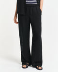 Crafted from a linen-viscose blend, these relaxed-fitting pants are a summer staple. Designed for an easy pull-on style, they feature an elasticated waistband with a mid-rise waist and a straight leg. Details include front slanted pockets, creases at the leg and a high hem stitch detail.