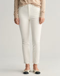 A contemporary, clean and crisp jean to brighten your denim wardrobe. Garment-washed for a soft hand-feel, these white jeans are designed for a slim fit with a high-rise waist and cropped leg. Crafted from cotton-elastane, they have high stretch for great recovery and comfort. Details include unbranded denim buttons, a classic 5-pocket design and a leather GANT label attached at the back waistband.