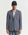 Crafted from a cotton blend with a two-toned jersey fabrication, this blazer is designed with a classic single breasted design. Cut for a slim fit with a length that falls right at the hips, it has a two button front, notch lapels, a chest welt pocket and bio horn buttons. Fully lined, it also features patch pockets, vents at the back and decorative top stitching.