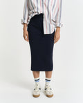 Made from a soft cotton blend, this cable knit skirt is designed for a slim fit and features a mid-rise waist. The midi length design has a ribbed knit elastic waistband and a GANT Archive Shield graphic embroidered right below the waist.