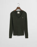 An American sportswear classic, the cable knit sweater has roots with the Aran Islands and Irish fisherman, but has been adored by everyone from Hollywood film stars to boarding school students around the world. Crafted from a soft cotton elastane blend for a slim yet stretchy fit, our version keeps it crisp and versatile with ribbed details, a V-neck, and our signature shield graphic embroidered at the chest. Plus, in a range of neutrals and vibrant seasonal hues, you can justify one in every color.