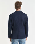 Crafted from a wool-cotton blend with a two-toned jersey fabrication, this blazer is designed with a classic single breasted design. Cut for a slim fit and with a length that falls right at the hips, it has a two button front, notch lapels, a chest welt pocket and branded imitation horn buttons. Fully lined, the design is complete with a back vent for ease of movement and a removable description label at the sleeve.
